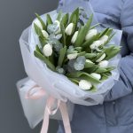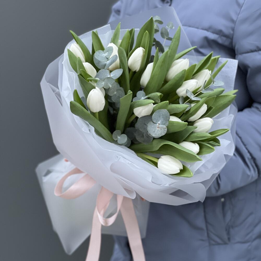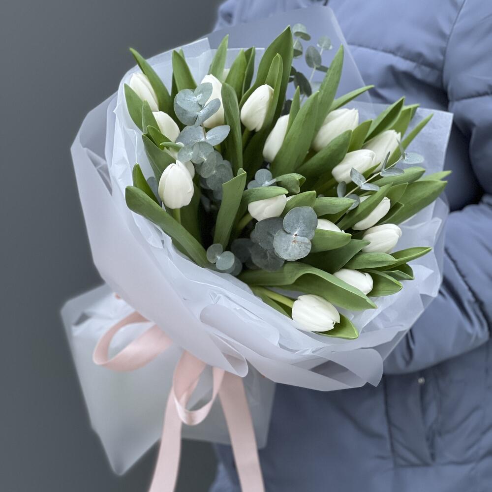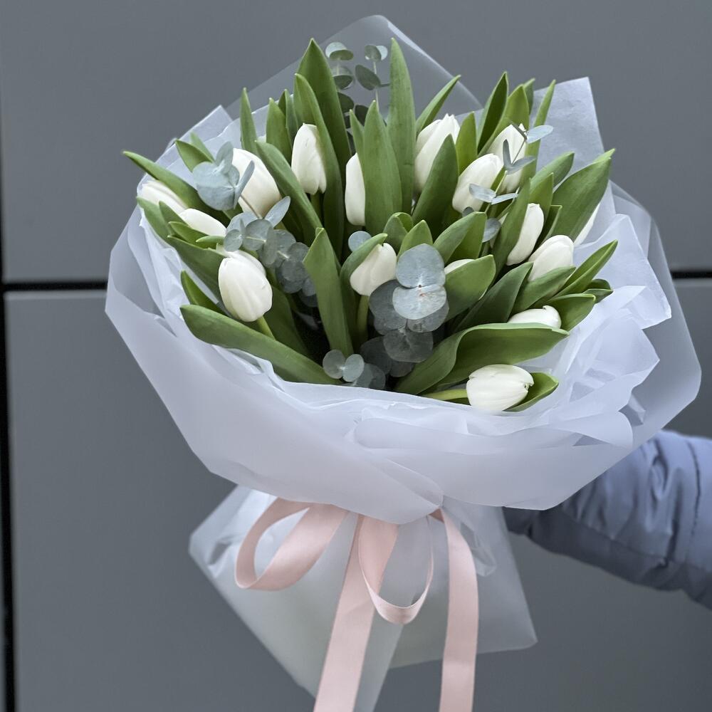 Тюльпан белый – 19 шт. Эвкалипт – 2 шт. Оформление – 1 шт.