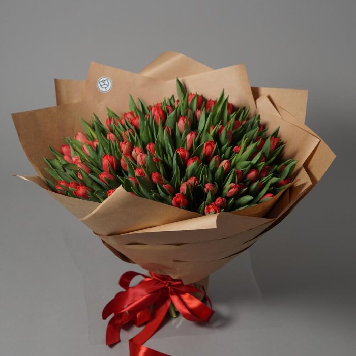 Букет из 101 тюльпана стандарт микс в стильной упаковке