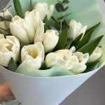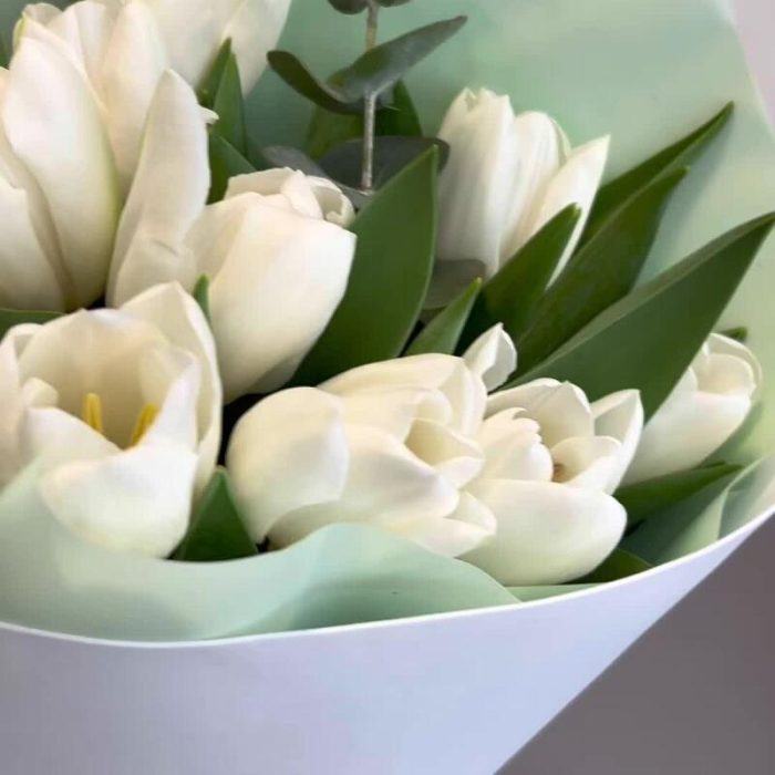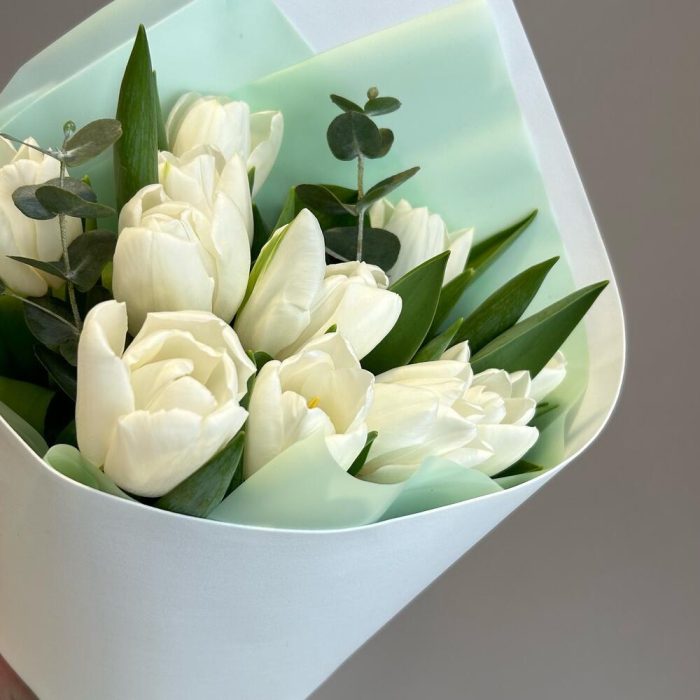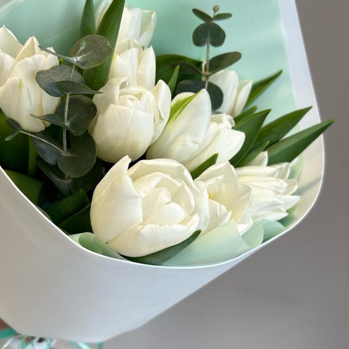 Букет из нежных белых тюльпанов с веточками эвкалипта
