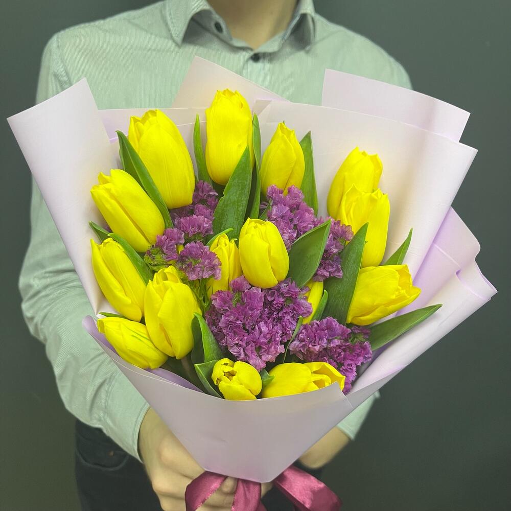Тюльпан желтый – 15 шт.статица ярко-розовая – 1 шт.Упаковка корейская пленка – 1 шт.Лента атласная – 1 шт.