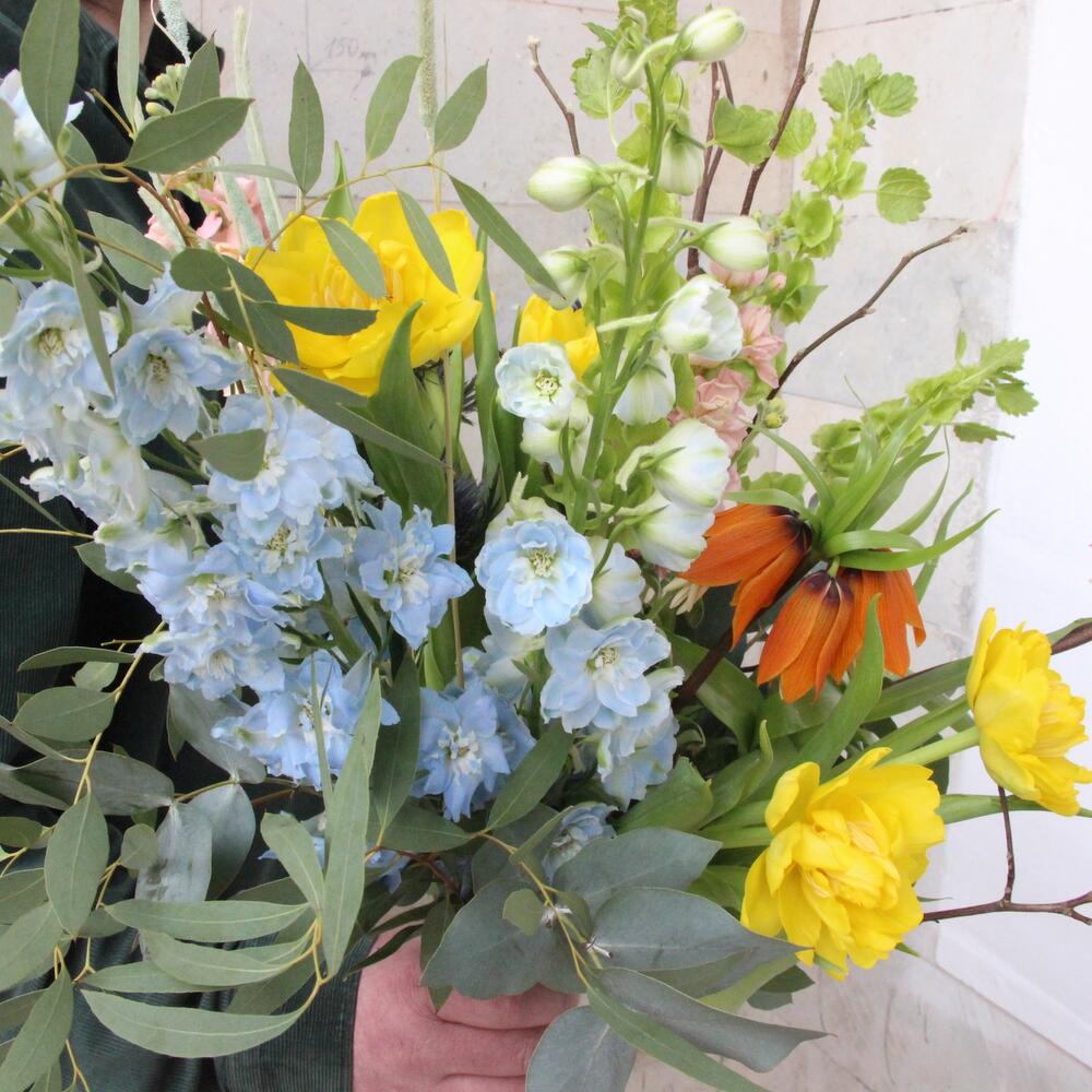 Авторский, весенний букет с рябчиками, махровыми тюльпанами, дельфиниумом, эрингиумом, маттиолой и сухоцветами.
