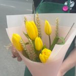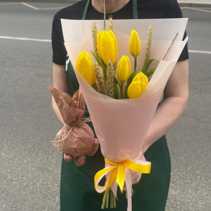 Крафт – 1 шт.Тюльпан желтый – 5 шт.Упаковка корейская пленка – 1 шт.Лента атласная желтая – 1 шт.Лента атласная нежно-розовая – 1 шт.бечевка натуральная – 1 шт.пшеница сухоцвет – 5 шт.ароматное яблоко – 1 шт.