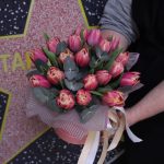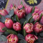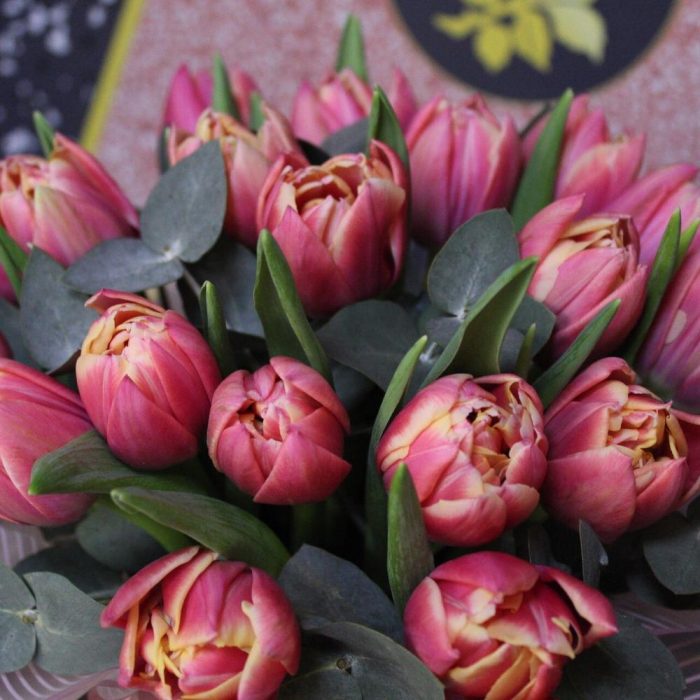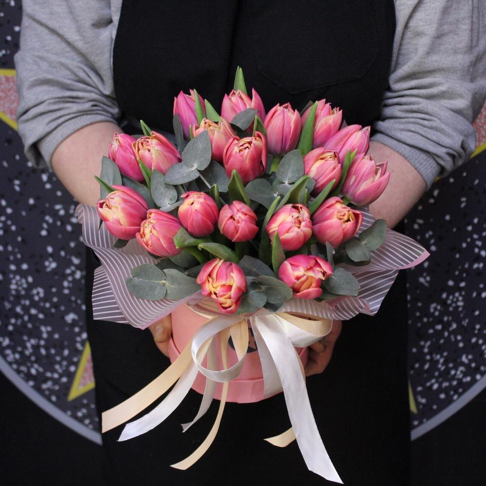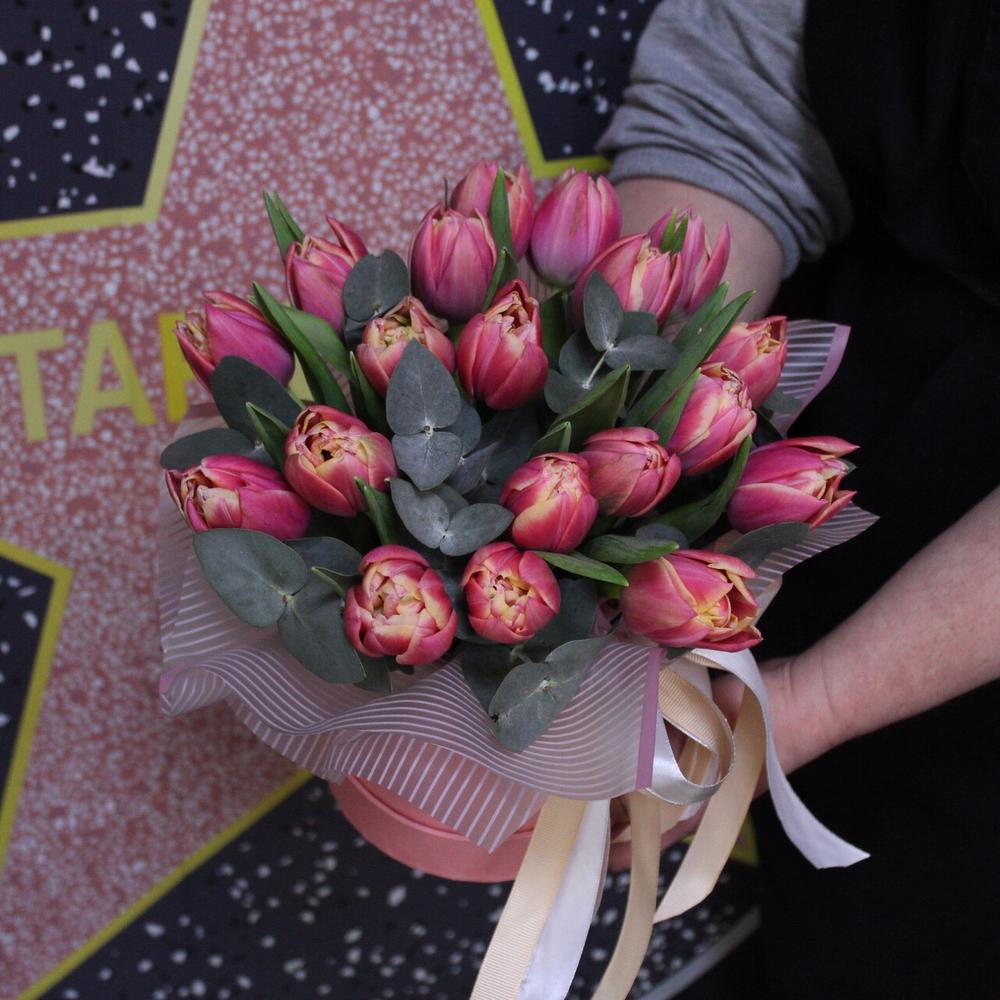 тюльпан пионовидный коламбус – 19 шт.Эвкалипт – 2 шт.Пленка дизайнерская – 1 шт.Шляпная коробка – 1 шт.