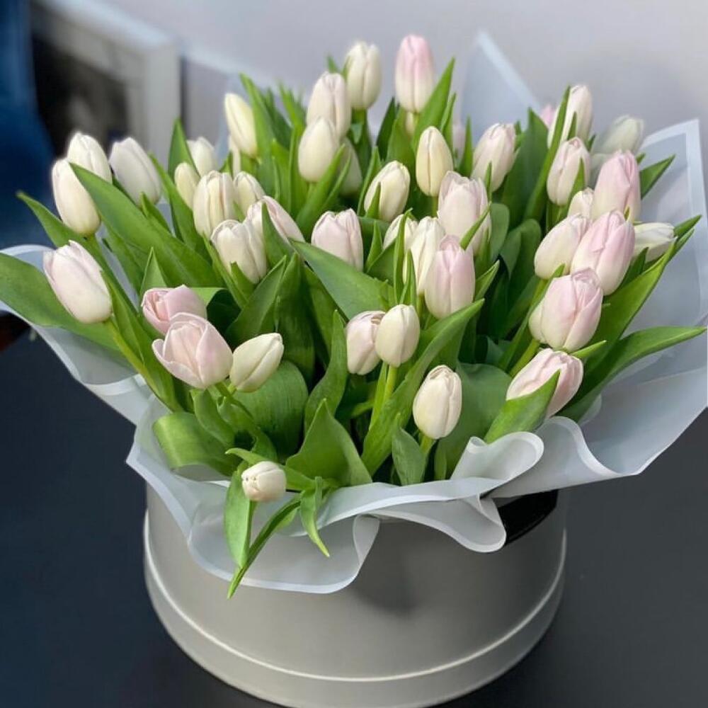 Тюльпаны белые в шляпной коробке