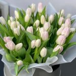 тюльпаны белые – 51 шт.Коробка шляпная – 1 шт.Упаковка дизайнерская – 1 шт.Лента атласная – 1 шт.Открытка – 1 шт.инструкция по уходу за цветами – 1 шт.хорошее настроение – 100 шт.Кризал – 1 шт.
