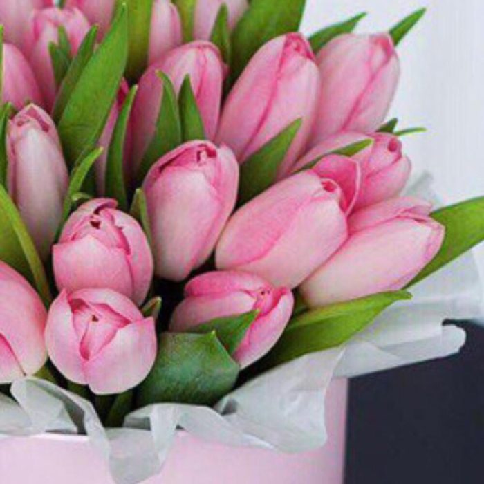 Нежно розовый тюльпаны в шляпной коробке , идеальное решение для подарка . Ваза больше не нужна . Тюльпаны подпитываются от флористической губки и стоят очень долго . )