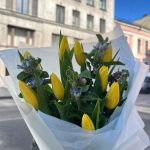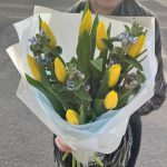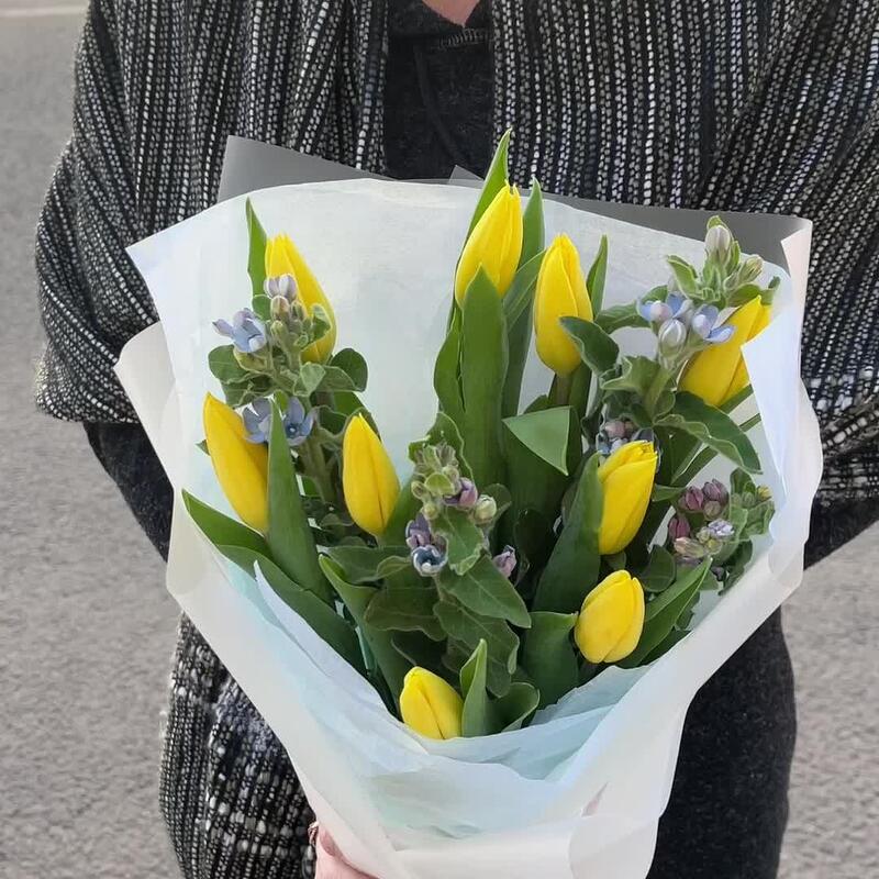 твидия голубая – 4 шт.Тюльпан желтый – 9 шт.тишью небесное – 1 шт.упаковке корейская пленка матовая – 1 шт.Лента атласная – 1 шт.