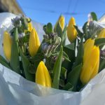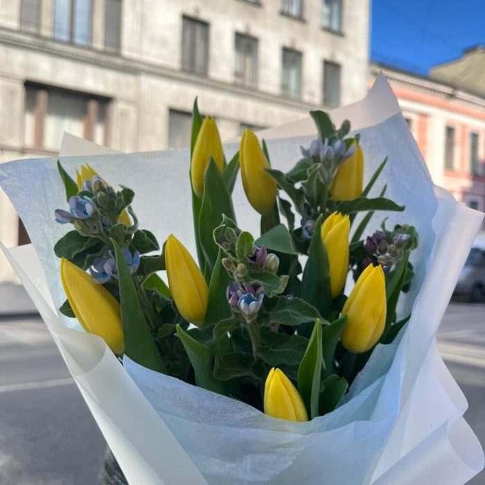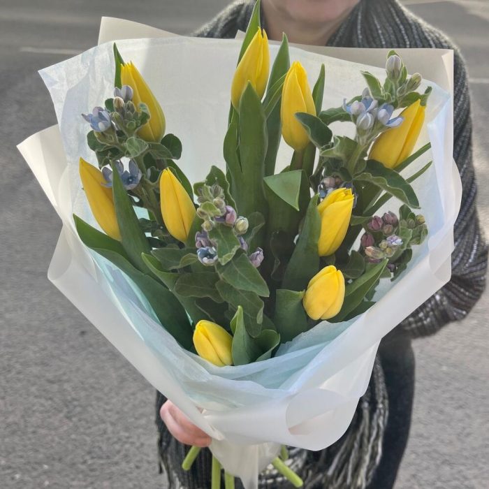 ЯРКАЯ ВЕСНА из жёлтых тюльпанов и голубой твидии