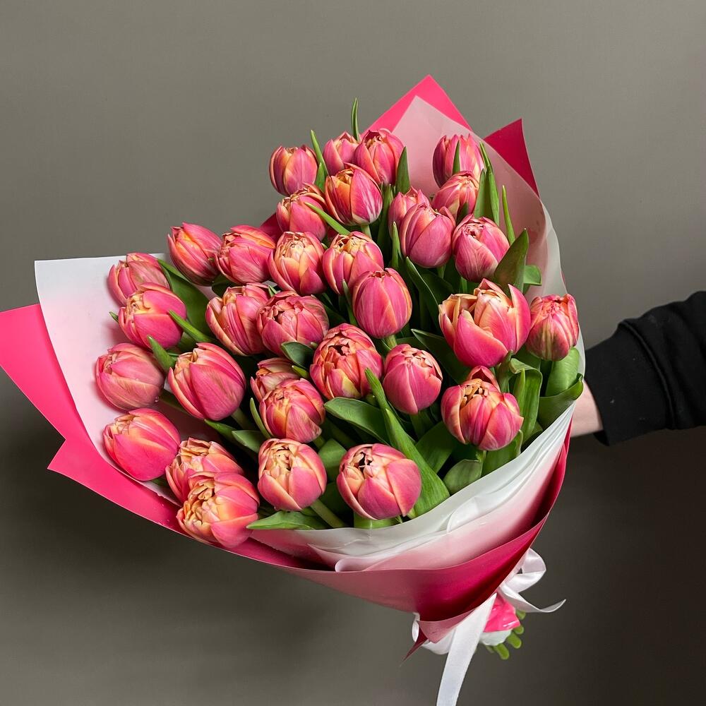 Яркий, большой, объемный букет из 31 пионовидного тюльпана. Эффектный подарок!