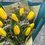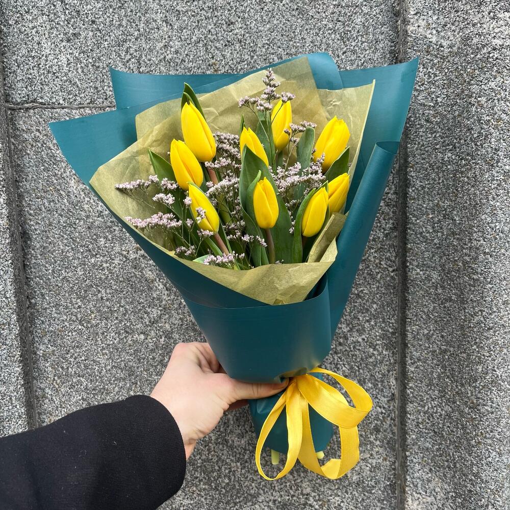 Yellow 9 тюльпанов с лимониумом