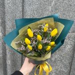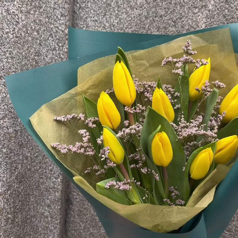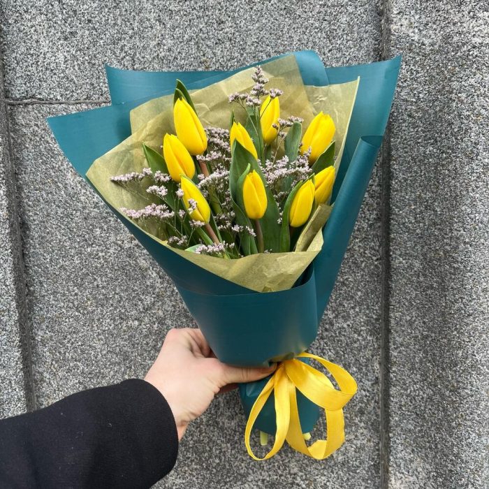 Тюльпан желтый – 9 шт.Лимониум – 1 шт.тишью золотое – 1 шт.Упаковка корейская пленка – 1 шт.Лента атласная – 1 шт.