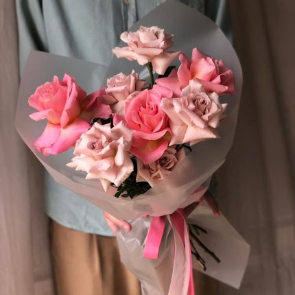 Розы 9 шт в тубусе с гипсофилой и эвкалиптом