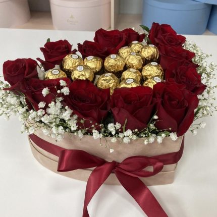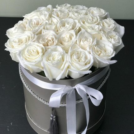 Шляпная коробка с розами, гвоздикой, гипсофилой и антуриумом “Kenzo box”