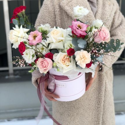 Коробка Робкий поцелуй из роз сорта квинси, охара, эустомы, генисты и диантуса